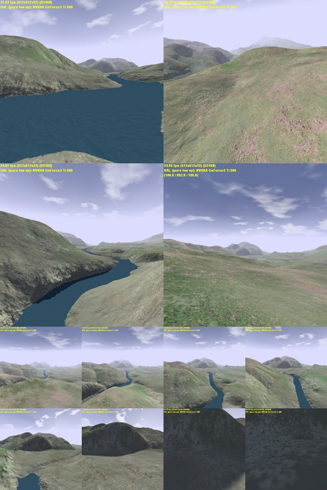 Actually, I lied. The entire scene is composed of two textures - the skybox and the terrain map. The terrain map is a 16384x16384 RGB file (grand total of 268M pixels!). In its uncompressed form, it consumes 768MB and after pre-computation, it is over 1GB! The landscape is modelled to be 8192x8192 meters, giving the terrain map a resolution of 4 pixels/m^2 - quite some detail! The terrain data and texture data are stored in a quadtree-like data structure that facilitates fast dynamic level-of-detail for both of them. In this demo, there are 128x128 bezier patches (sorry non-GeForce3+ users) that compose the terrain, and each is associated with "relative" texture coordinates (uv's relative to the entire terrain).