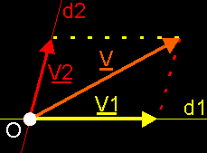 (r*U)+(s*V).![]() Notice that the vectors r*U and s*V start at the origin too! In fact, all vectors start at the origin now. You can also do linear combinations with more vectors: r*U + s*V + t*W. This would be equal to (r*U)+(s*V)+(t*W). b) Decomposition Of A Vector: Say, you’ve got a vector V and two directions (lines) d1 and d2. You want to decompose this vector into two new vectors V1 and V2 with the given directions. (Why the ... would you want to do that?, you ask) That is, you want to find 2 vectors V1 and V2 that have the directions d1 and d2 respective, in such a way that if you add V1 and V2 together, you get V1+V2=V. Just create a parallelogram (the sides are parallel with the d1 and d2), and voilà, you have your 2 new vectors. ![]() c) Perpendicular Projection: If we have 2 vectors U and V, and we want to project V perpendicular on u (=the direction of U). How do we do that? ![]() Let's call the result vector V". If we look at the picture, we see that ||V"|| = ||V||*cos(theta), with theta the angle between U and V (trigonometry). This sounds familiar! It's a little bit like a dot product U·V = ||U||*||V||*cos(theta). If we look closer, we can see that ||V"|| = (U·V)/||U||. Now, how do we construct V"? We can see that V" has the same direction as U, so it should be possible to construct V" by a scalar product of U. Which scale should we take? We need to go from magnitude ||U|| to ||V"||, so we need to scale it with ||V"||/||U||. This results in: V" = (U·V)/||U||²*U = (U·V)/(U·U)*U ![]() For those people who weren't listening the last time: notice that the vector V" starts in the origin too. In fact, all vectors start in the origin! d) Mixed Product Or Triple Product: (U V W) This is an extra operator that I want to show you. It’s not so important, because it’s only a combination of the dot product and the cross product. definition: (U V W) = (U×V)·W = ||U||*||V||*||W||*sin(theta)*cos(phi) ![]() Interpretation: First, work out U×V and call the result Z . Z is a vector perpendicular to U and V. The magnitude of Z is equal to the area of the parallelogram between U and V: ||Z|| = ||U||*||V||*sin(theta). The original product is now simplified to Z·W . This dot product gives us a real value equal to ||Z||*||W||*cos(phi). We already know what ||Z|| is, and on the figure you can see that ||W||*cos(phi) is the height of the parallelepiped between U, V and W (kind of deformed beam). We know (at least I do :) that the volume of a parallelepiped is given by the base area multiplied with the height. Thus ||Z||*||W||*cos(phi) is the volume of that thing. Anyway: The mixed product (U V W) gives us the volume of the parallelepiped between U, V and W: ||U||*||V||*||W||*sin(theta)*cos(phi) Notice that: ° (U V W) = (V W U) = (W U V) = –(U W V) = –(V U W) = –(W V U) ° (r*U V W) = (U r*V W) = (U V r*W) = r*(U V W) ° (U V W) = 0 if the 3 vectors lay in 1 plane (the parallelepiped is flat). |